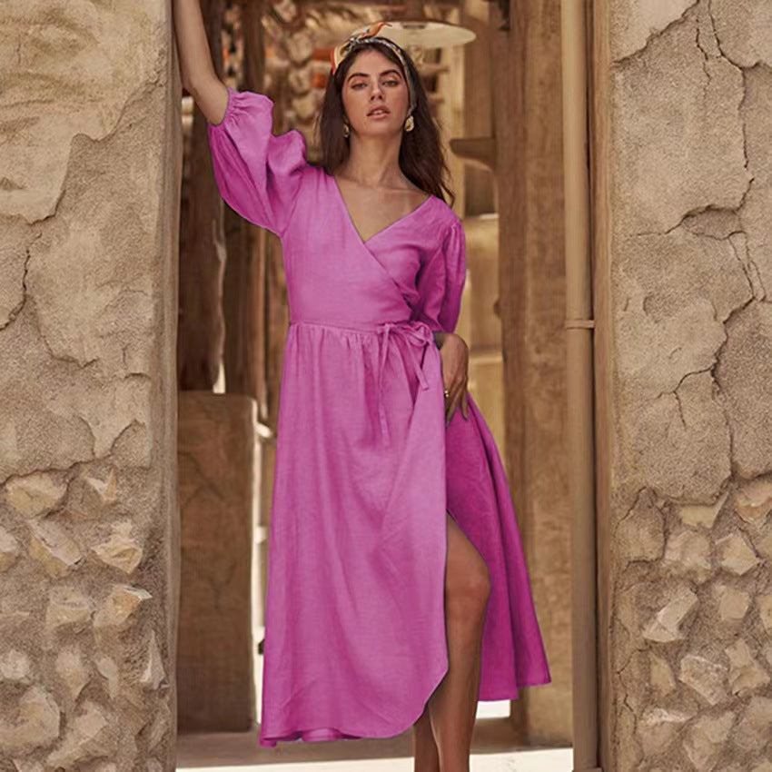 Тази рокля е изработена с изключително внимание към детайлите и високо качество на материалите. В-образното деколте добавя женственост и изтънченост на визията, докато цепката на роклята придава смелост и модерност. Силуетът на A-линията подчертава женските извивки и предлага комфортно прилягане.