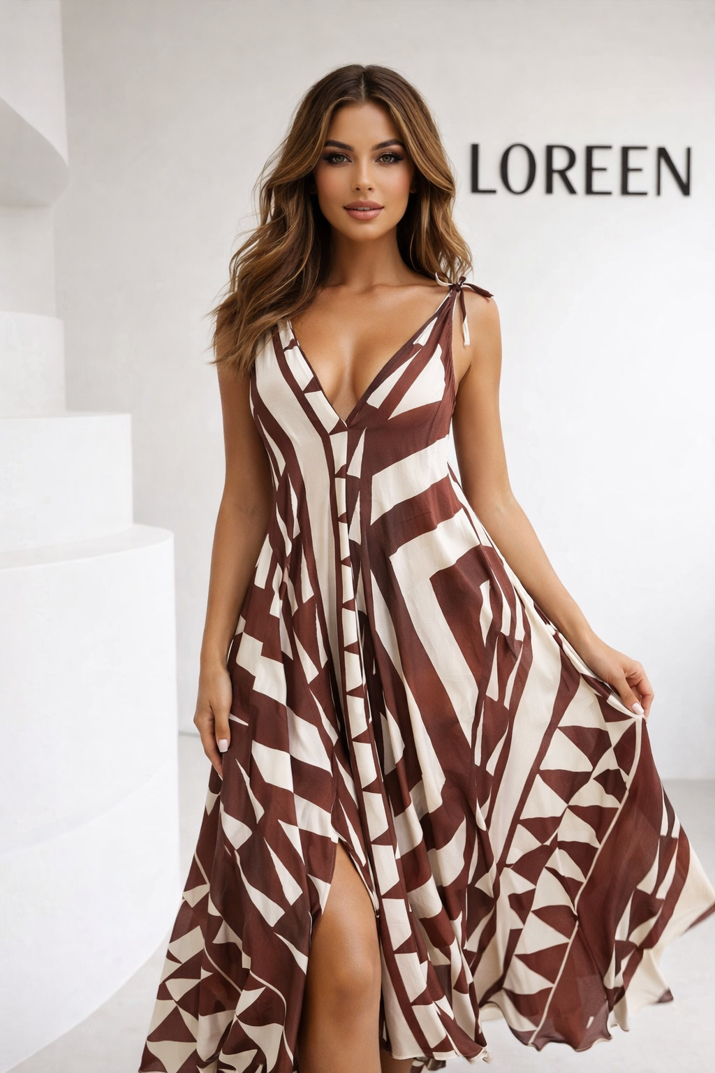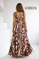 Mocha Geometry е елегантна макси рокля с артистичен геометричен принт в топли кафяво-крем нюанси 🤎