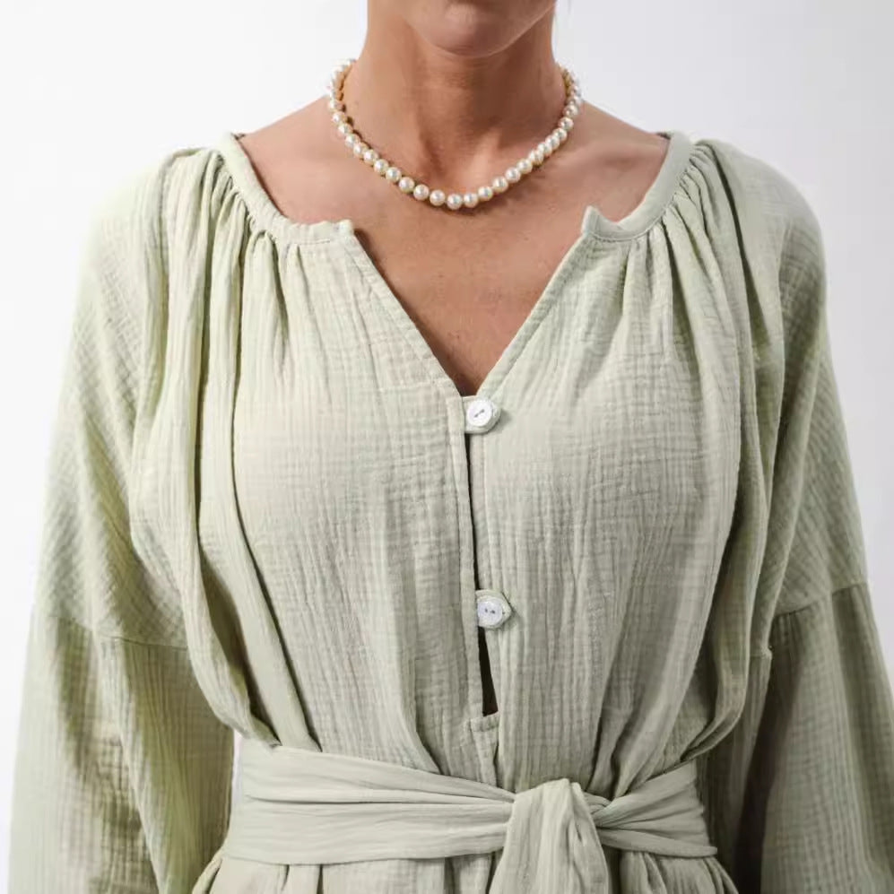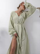 Елегантна дамска памучна рокля с миди дължина и стилни цепки, съчетаваща комфорт и женственост. Изработена от мек и дишащ памук, идеална за ежедневието или специални поводи. Свободната кройка осигурява лекота и удобство през целия ден.