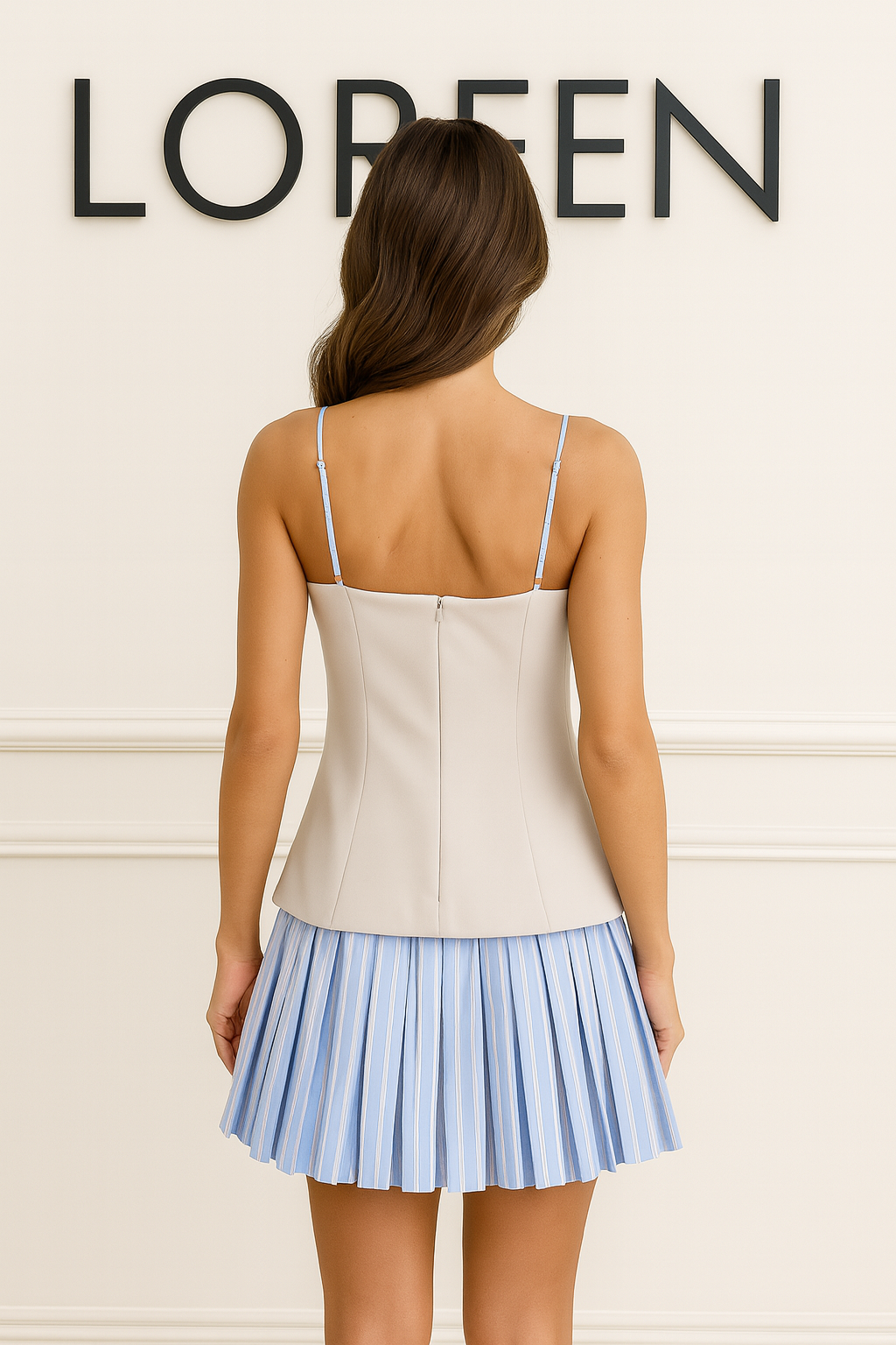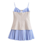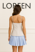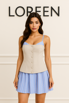 Елегантна дамска рокля с корсетен силует, която подчертава талията и придава изтънчена женственост. Моделът комбинира втален корсет в нежен бежов нюанс с ефирна пола на светлосини райета, създавайки свежа и модерна визия. Фините презрамки и декоративните копчета добавят стилен акцент.