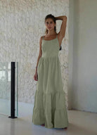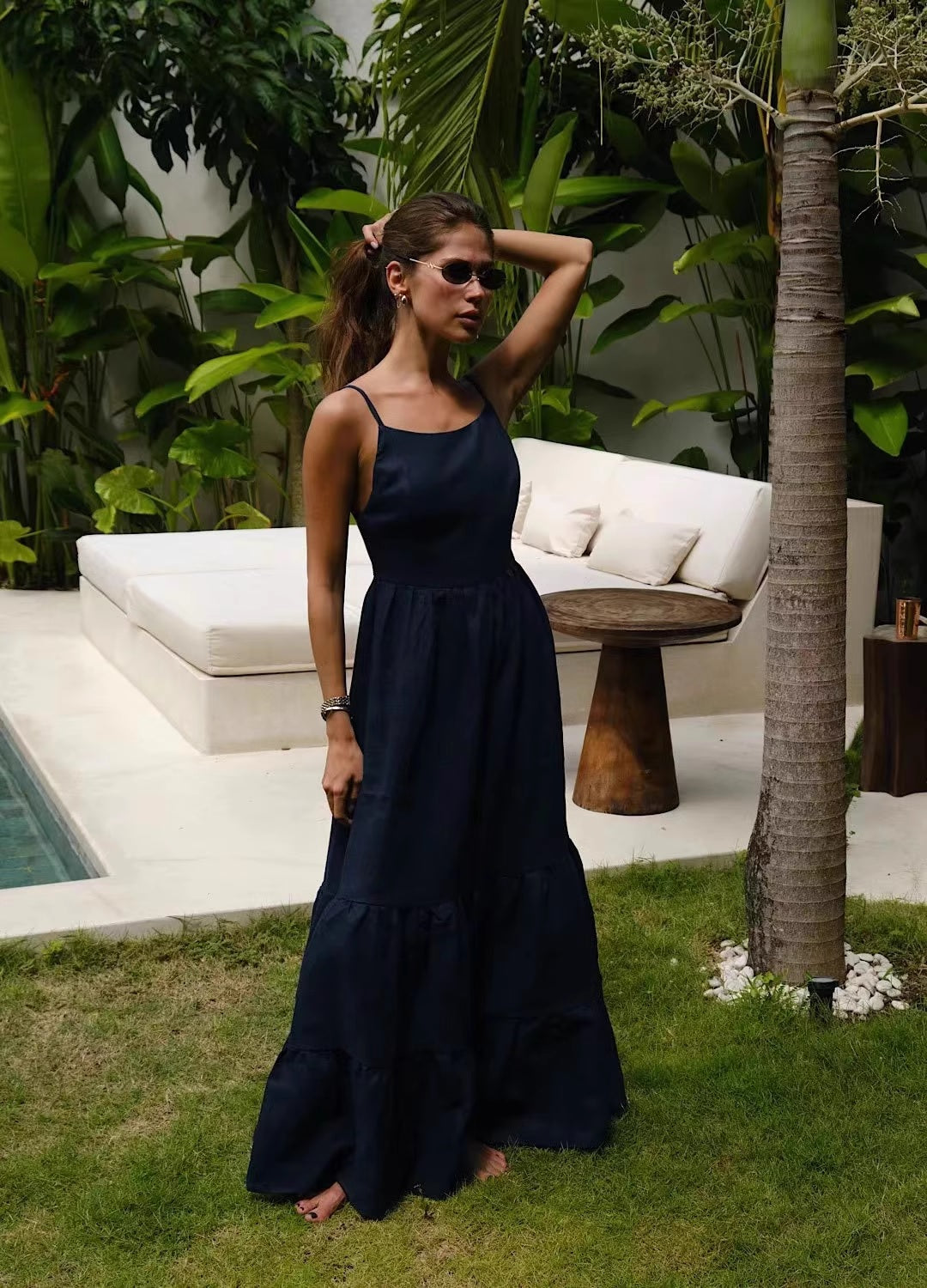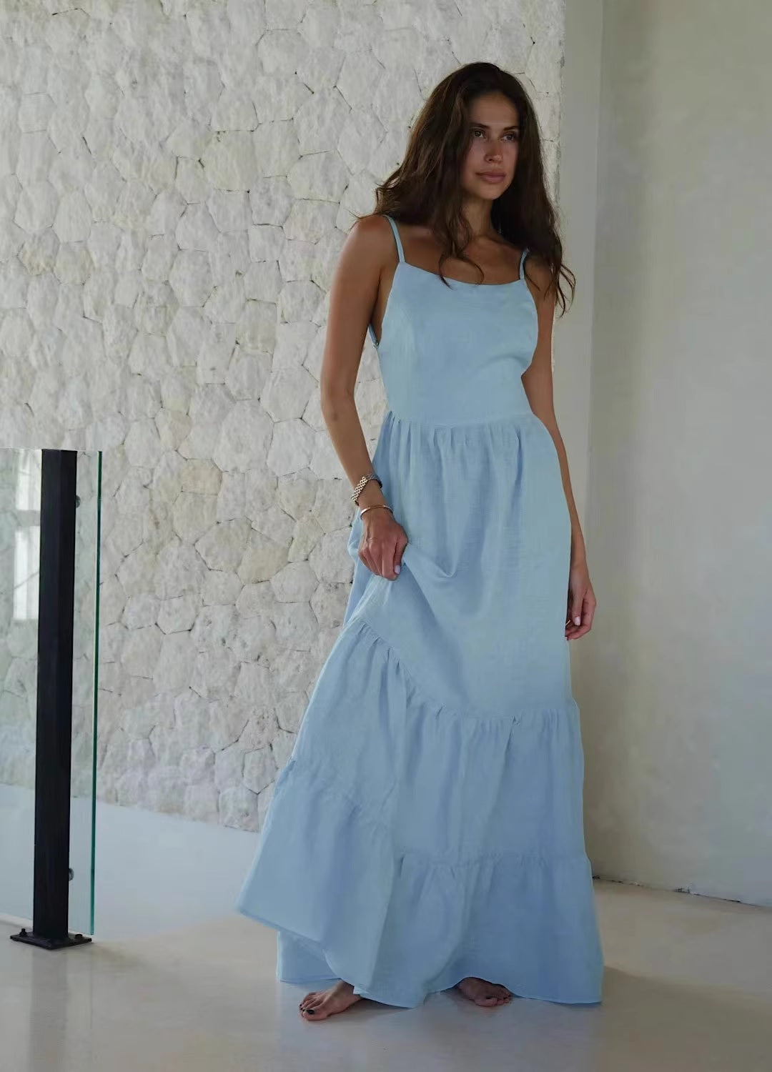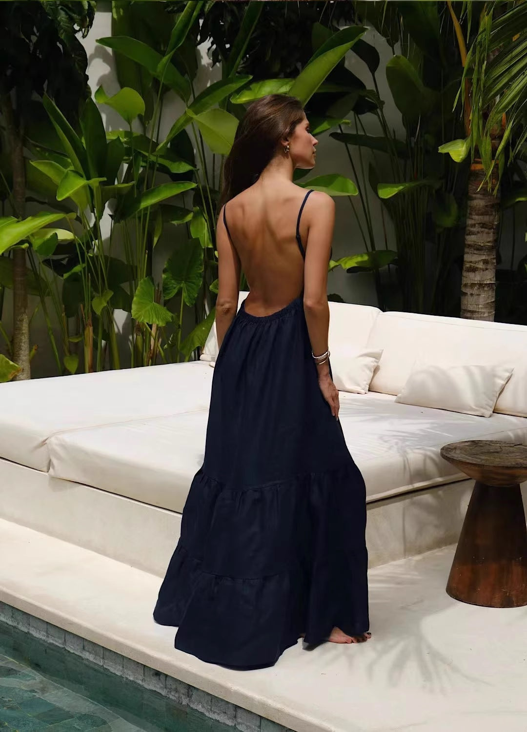 Тази дълга памучна рокля с тънки презрамки и гол гръб е олицетворение на елегантност и комфорт. Изработена от висококачествен памук, роклята предлага несравнима мекота и дишаемост, идеална за топлите летни дни.