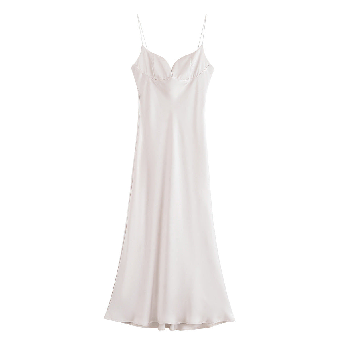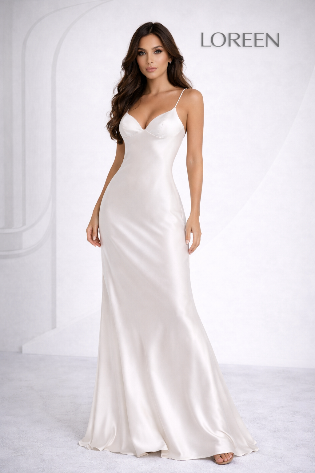 Silk Whisper е ефирна дълга рокля с изчистен силует и деликатни тънки презрамки 🤍