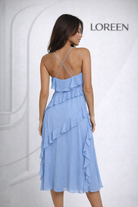Романтична дамска миди рокля с ефирен силует и фини каскадни волани, които създават движение и изключително женствено излъчване. Моделът е с тънки презрамки и V-образно деколте, подчертаващо деколтето по елегантен начин. Леката материя и нежният небесносин цвят придават свежо и изтънчено усещане, идеално за летния сезон.