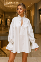 "Bella Époque е рокля, вдъхновена от романтиката и лукса. С ефирна бяла материя, елегантни буфан ръкави и деликатни връзки на деколтето, тя носи усещане за нежност и класа. Черният корсетен колан със златни копчета подчертава талията и придава модерен, изискан силует. Подходяща за специални събития и вечери, когато искате да блеснете."