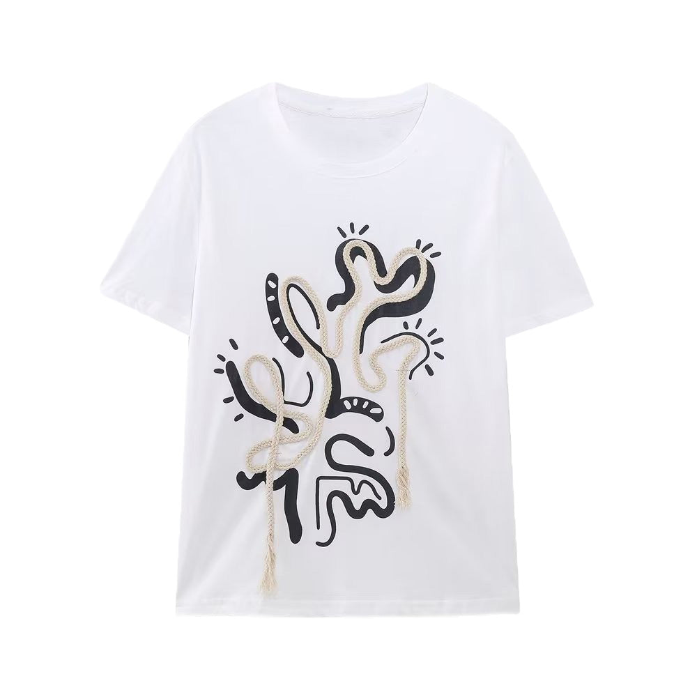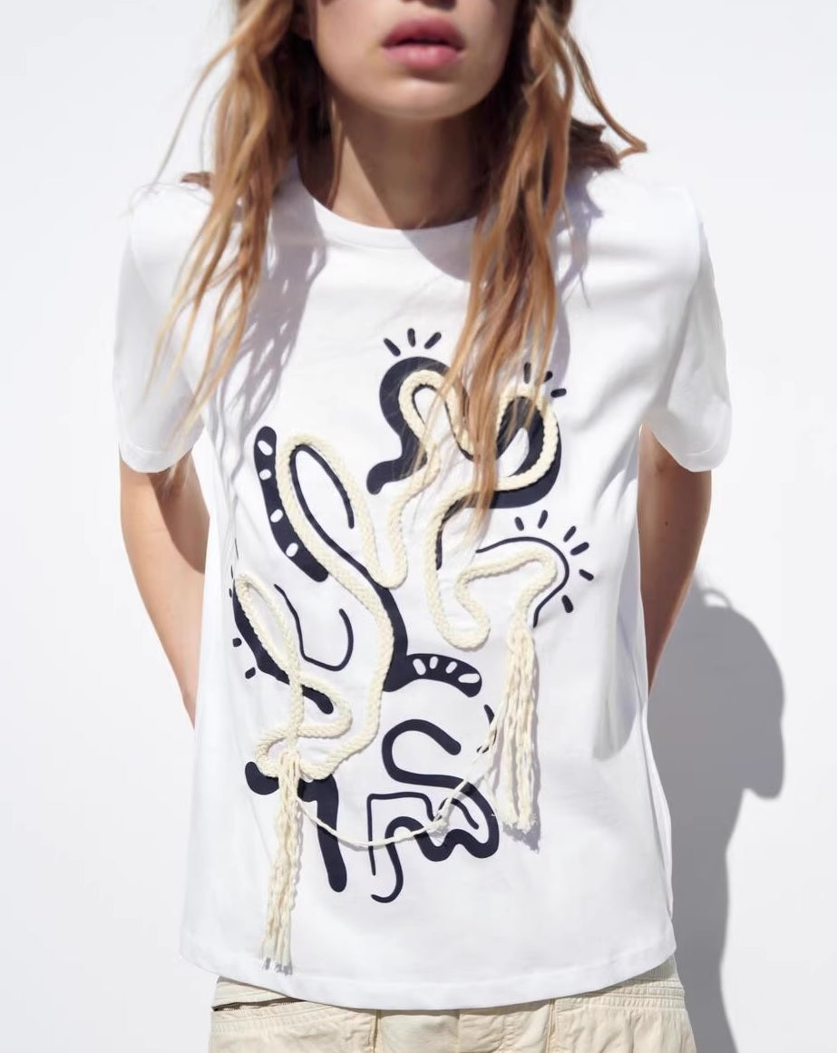 Останете готини и шик в тази модерна дамска тениска, изработена от висококачествен памук за максимален комфорт. Привличащият погледа щампа отпред придава забавен и модерен привкус, идеален за добавяне на нотка усет към вашите ежедневни тоалети. Съчетайте го с дънки или шорти за небрежен, но стилен ансамбъл.