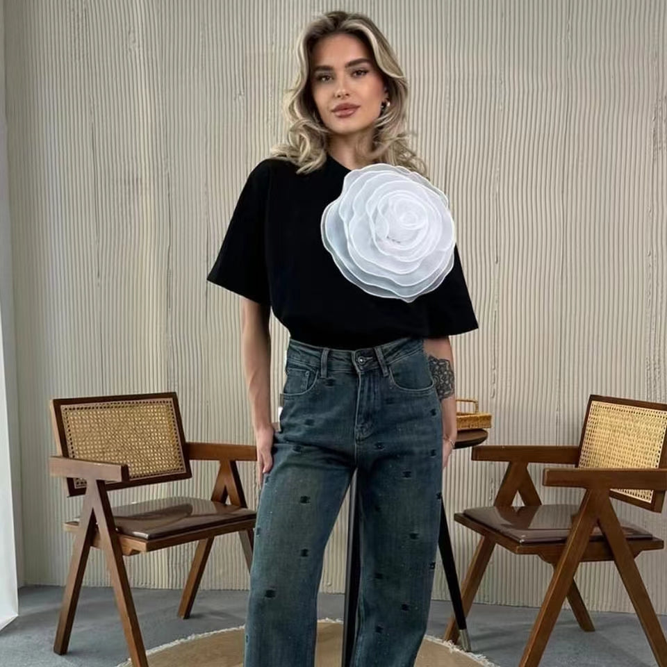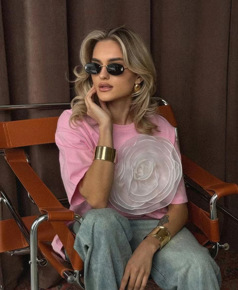 Тениската разполага със съчетание от тримерна мрежа и изящни 3D цветя, които придават текстура и измерение на дрехата. Този игрив елемент добавя интерес към визията и прави тениската подходящ както за ежедневието, така и за по-специални поводи.