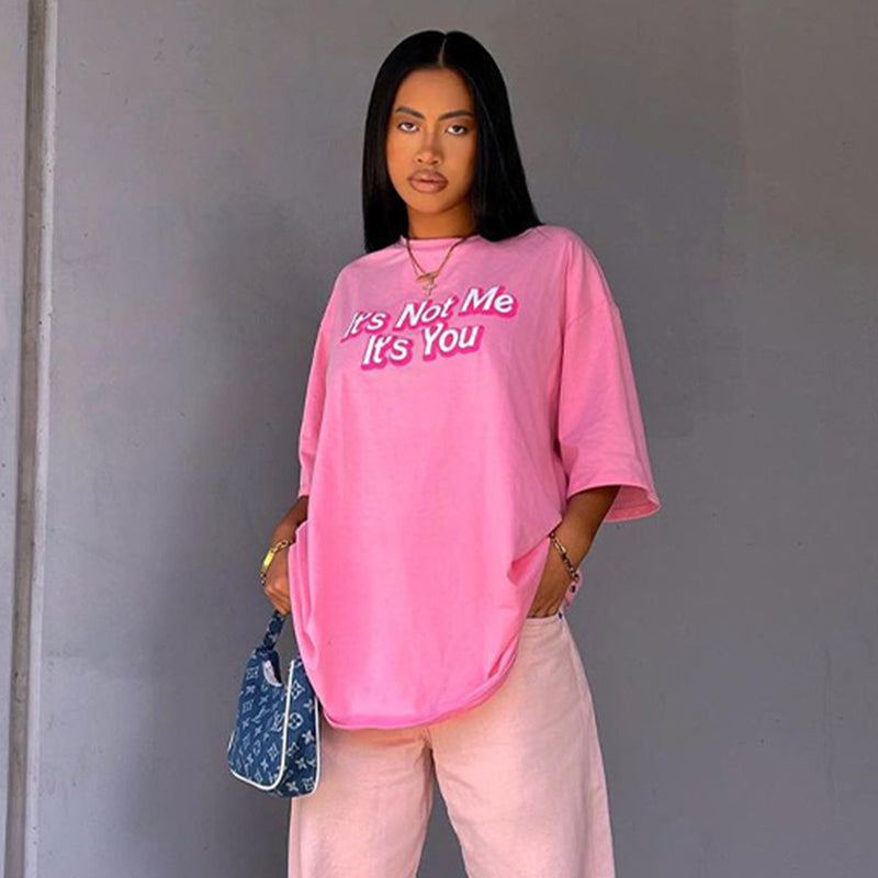 Освен това, розовият цвят добавя женственост и свежест на модела, подчертавайки женската индивидуалност и стил. Късите ръкави осигуряват комфорт през горещите летни дни, докато оверсайз силуетът придава на тениската модерен вид.