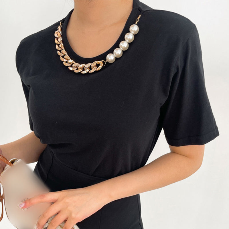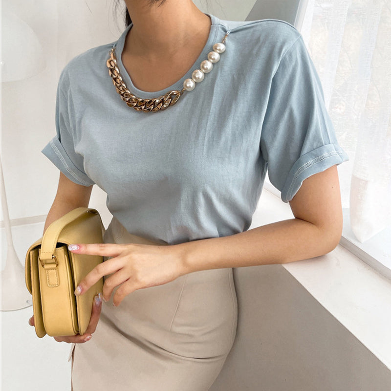 Топът е едноцветен, с основни цветове бяло, черно и светло синьо, които са подходящи за различни комбинации.