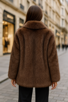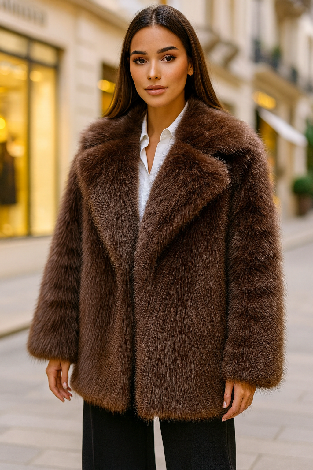 Палтото Luxe Mocha Fur Coat е въплъщение на изисканост и модерен лукс. Изработено от висококачествен еко пух с изключително мека и плътна структура, то осигурява топлина и комфорт дори в най-студените дни. Елегантната му кройка с обемна яка и леко свободна линия подчертава женствеността и придава неповторимо излъчване на стил и класа.