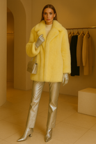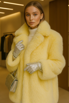 Палто Sunlit Chic е изискана комбинация от стил и комфорт за студените дни. Изработено от висококачествен еко пух в мек пастелно-жълт нюанс, то носи усещане за лукс и топлина. Свободната кройка и широката яка придават елегантен силует, докато нежната текстура създава впечатляващ обем.