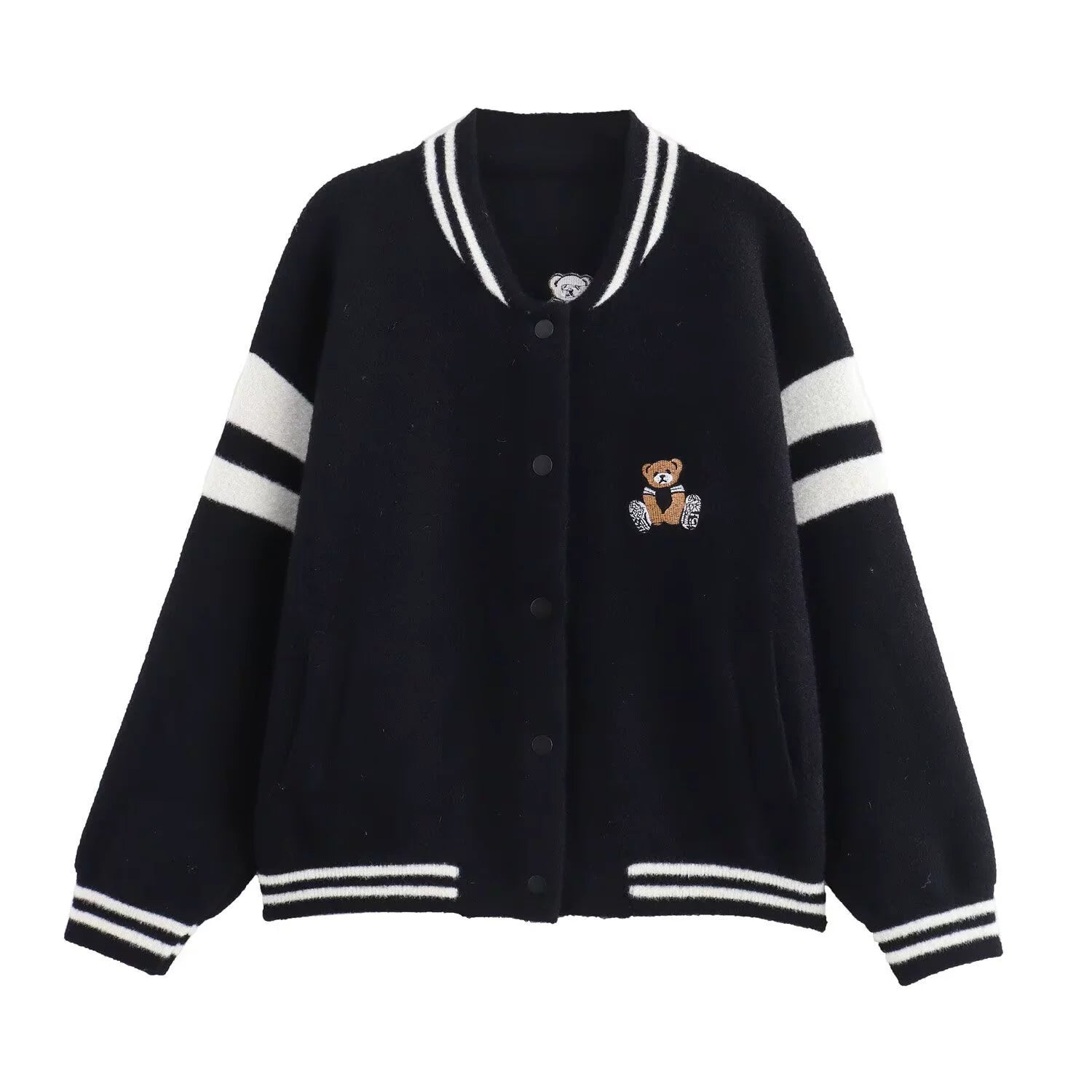 🧸 Chic Bear е стилна и уютна жилетка, вдъхновена от класическия varsity дизайн. Изработена от мека материя с контрастни детайли и игриво мече, тя съчетава комфорт и модерен градски стил.