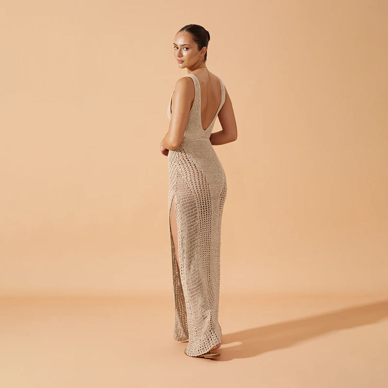 Елегантна дамска плетена плажна рокля с цепка, идеална за летни дни край морето. Изработена от лека и дишаща материя, която осигурява комфорт и стил. Цепката добавя модерен акцент, правейки роклята перфектна за носене над бански или за небрежна лятна визия.