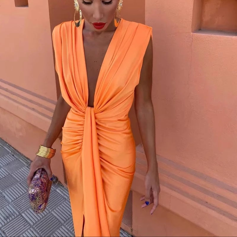 Дизайн: Дизайнът на роклята е изключително стилен и модерен, като се фокусира върху класическия и вечен V-образен силует. Това деколте придава изтънченост и подчертава деколтето, създавайки визуално удължаване на фигурата.