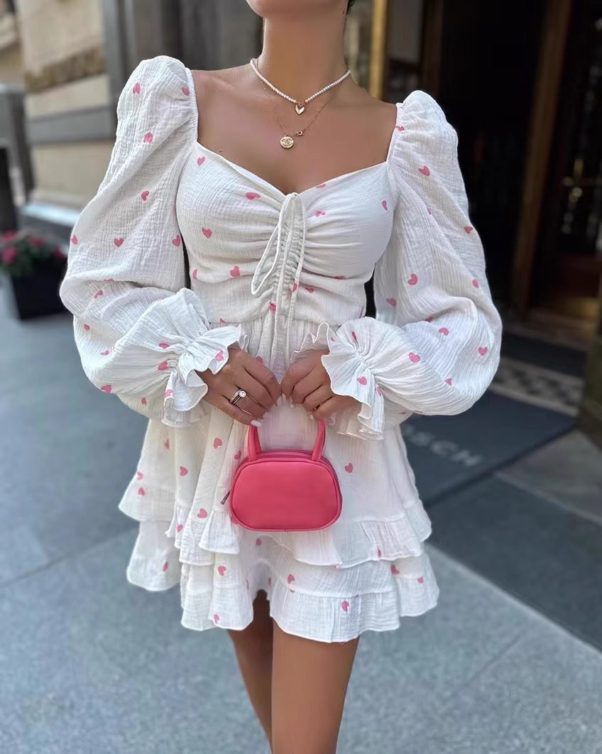 Квадратното деколте подчертава шията и раменете, а буфан ръкавите добавят ретро чар и женственост. Леката и дишаща памучна тъкан осигурява комфорт, докато любовният принт придава игривост и свежест на облеклото.