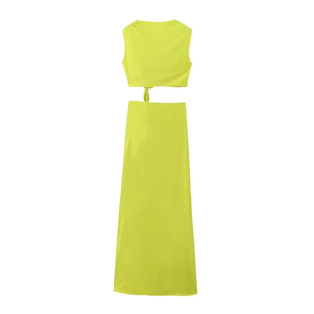 Роклята разполага с изкусително V-образно деколте, което подчертава шията и деколтето, като придава женствен и секси вид. Холоу дизайнът на роклята придава допълнителен акцент от изтънченост и загадъчност. Разрезът на роклята добавя доза сексапил, като разкрива нежната линия на краката.