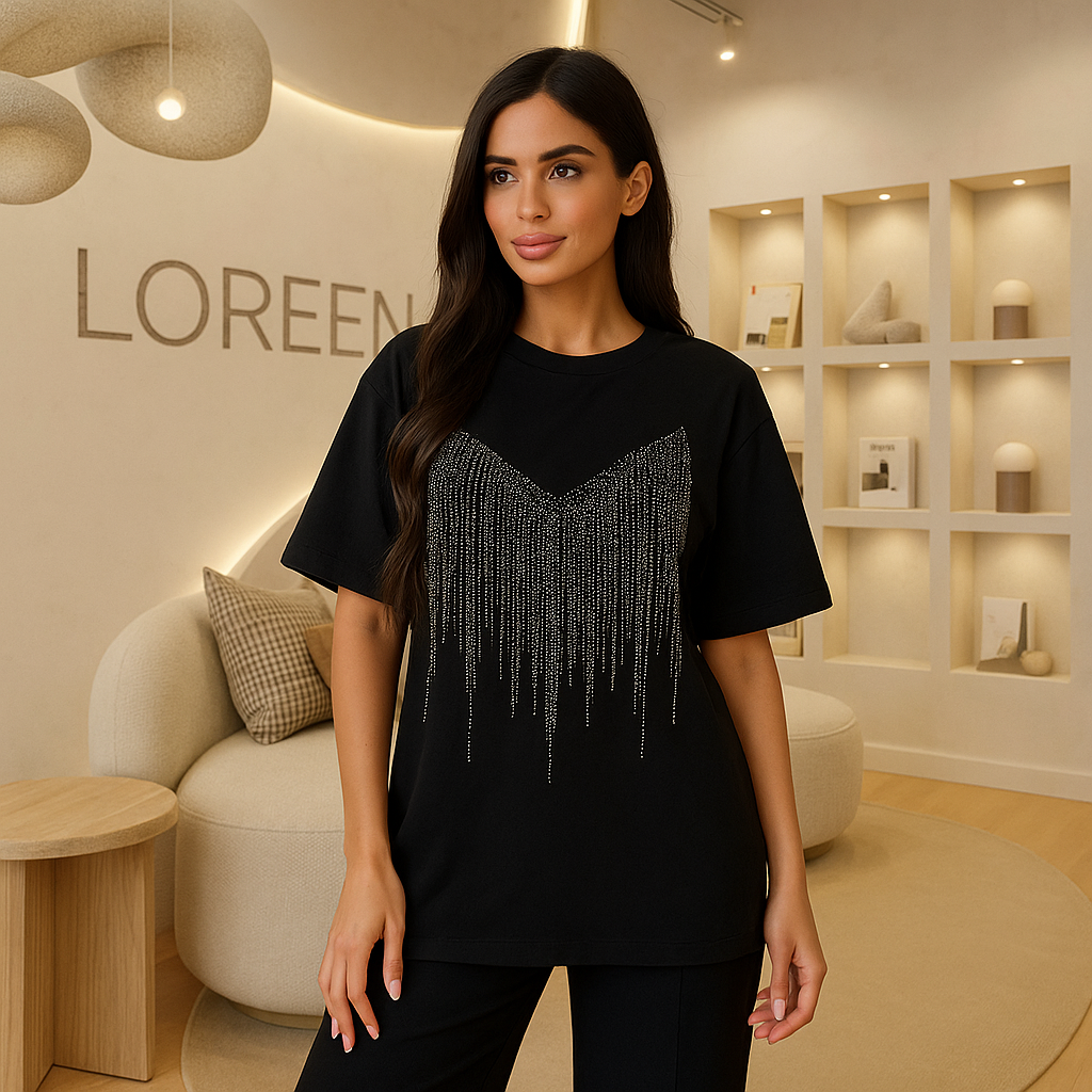 Стилна дамска тениска с изящно бюстие, изработено от блестящи камъчета, които добавят доза елегантност и блясък към вашата визия. Моделът съчетава удобството на класическата тениска с изисканата естетика на декоративни детайли, създавайки уникално и женствено излъчване.