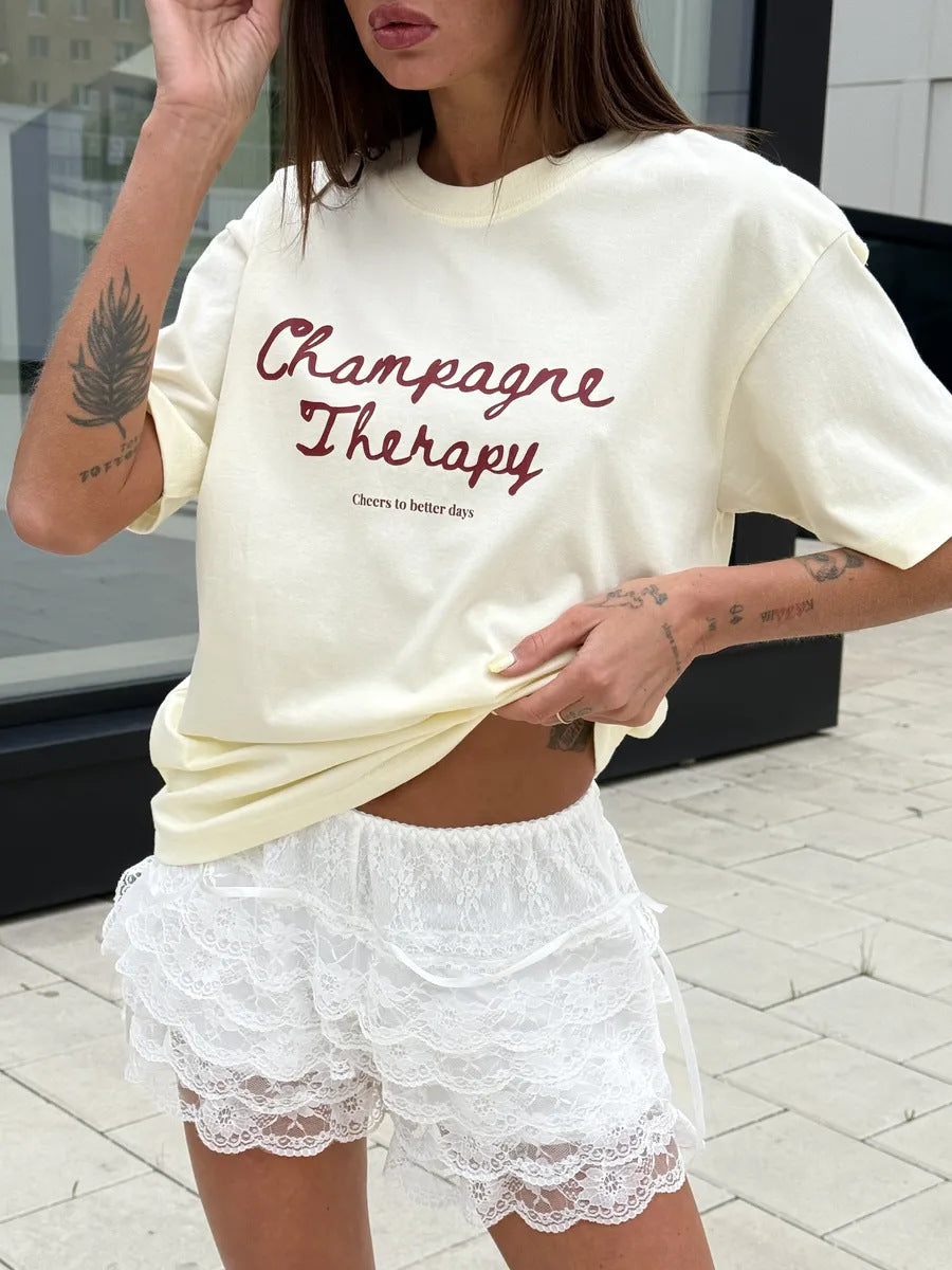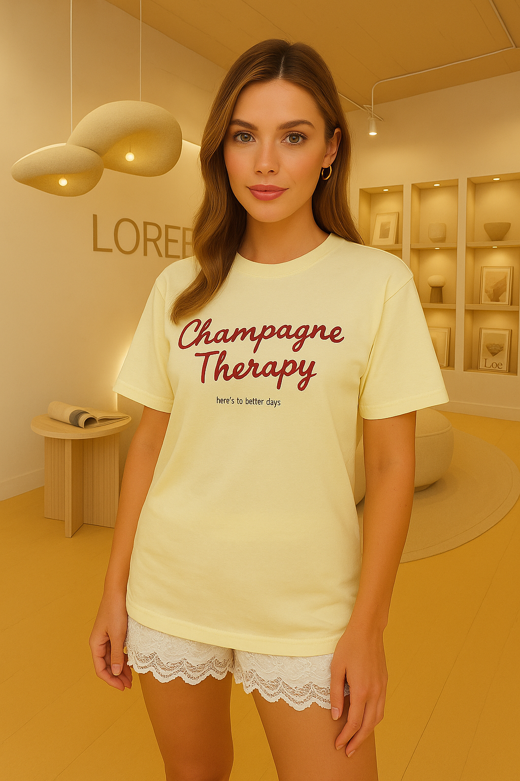 Потопи се в настроение за празнуване с нашата Champagne Therapy Tee – Vanilla Edition.