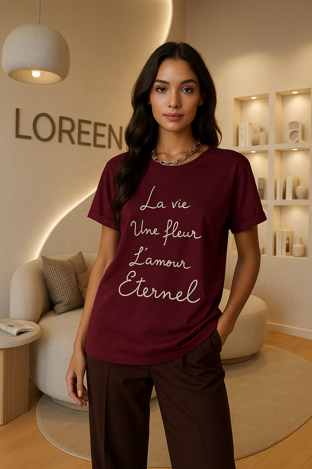 Стилна овърсайз дамска тениска с бродирани букви, придаваща елегантен акцент на небрежния стил. Изработена от мека и качествена материя, осигурява комфорт и свобода на движение. Универсален модел, който лесно се комбинира с дънки, шорти или клин за модерна и завършена визия.