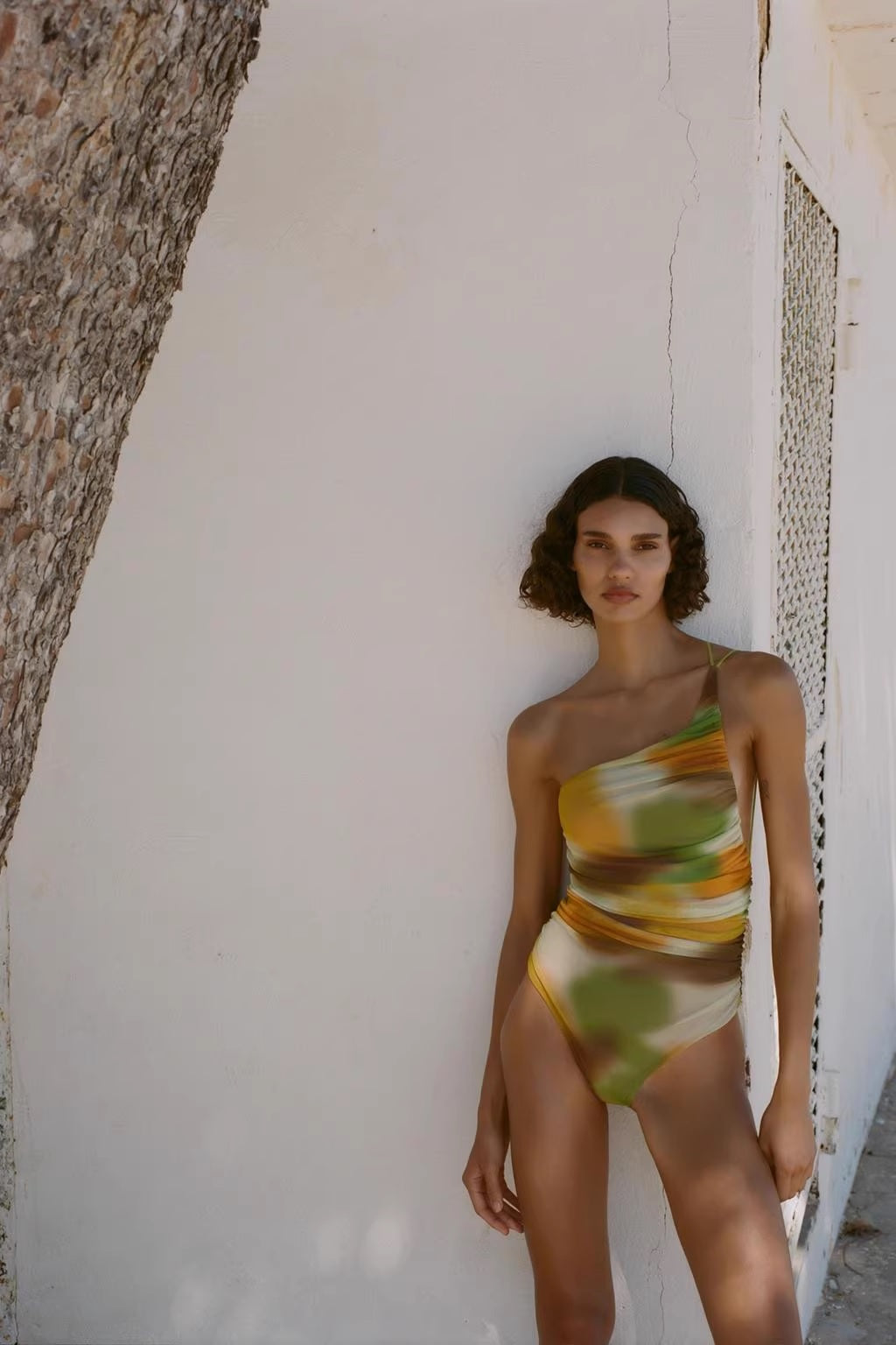 Дизайнът на банския костюм включва асиметрична кройка с едно рамо, което му придава уникален и съвременен вид. Принтът по цялата повърхност добавя допълнителен моден акцент и го прави перфектен за плажа или басейна.
