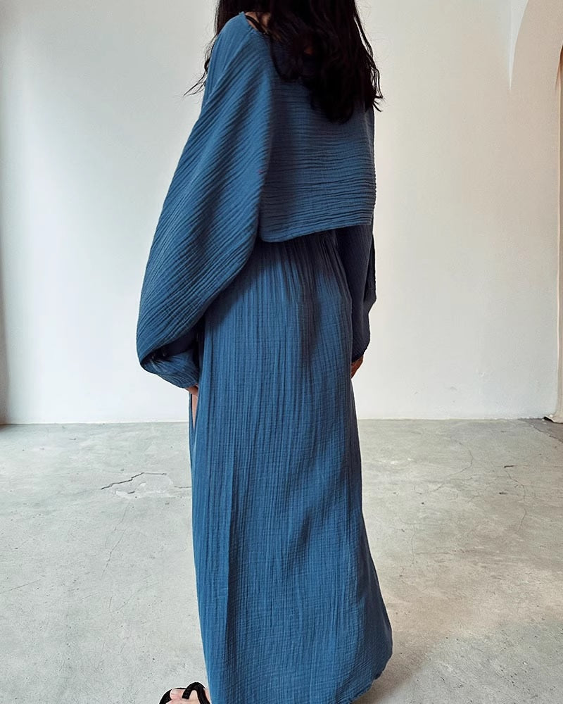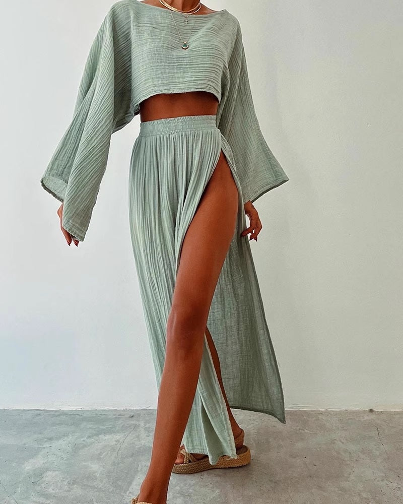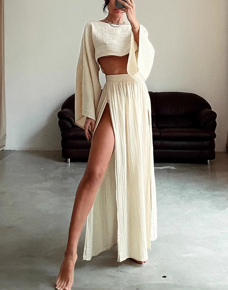 Ежедневен комплект от две части, изработен от смес лен и памук. Този шикозен комплект включва къс топ и пола с висока талия и цепка.
