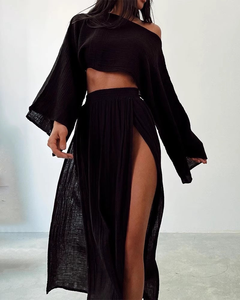 Късият топ е със свеж и модерен дизайн, идеален за летните дни, като подчертава талията и придава елегантен вид. Полата с висока талия осигуряват комфорт и стил, а цепките добавят нотка на съвременна изисканост и лекота.