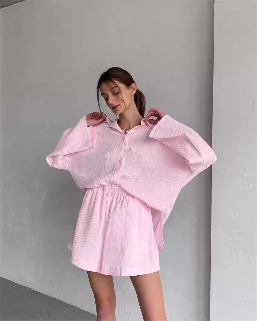 Дамският комплект от две части, включващ риза и къси панталони със свободен силует, е идеален за жените, които ценят комбинацията от комфорт и стил. Този комплект е подходящ за разнообразни поводи и гарантира модерна и небрежна визия, която подчертава индивидуалността и същевременно предлага удобство през целия ден.