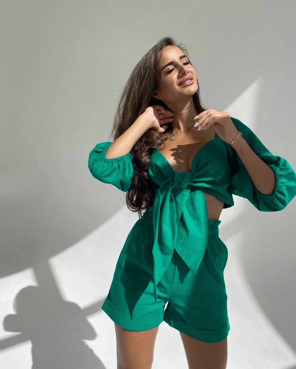 Тази двойки части се състои от странично регулируема блуза с дълбоко V-образно деколте и панталони с джобчета.Блузата е стилна и комфортна, създавайки леко и въздушно усещане, идеално за горещите летни дни. Панталоните са изработени от качествени материали и предлагат практичността на функционалните джобчета, като същевременно допълват визията си с модерен допир.Този комплект е подходящ за различни плажни и ваканционни дейности, като съчетава стилен външен вид с удобство и практичност. С него ще излъчвате лекота и елегантност на всяко морско приключение.