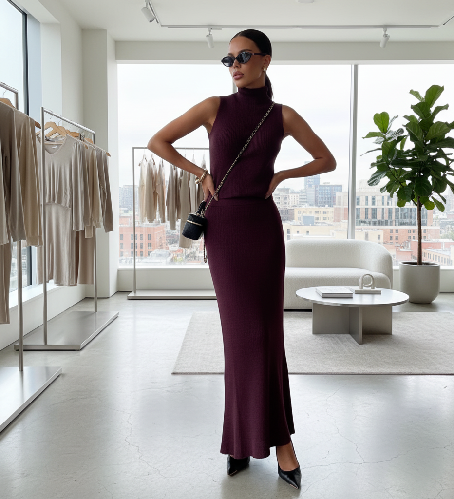 Изработен от фина ребрена плетка в наситен цвят, комплектът включва дълга пола с висока талия и топ с висока яка. Идеален за бизнес срещи, коктейли или стилна разходка в града.