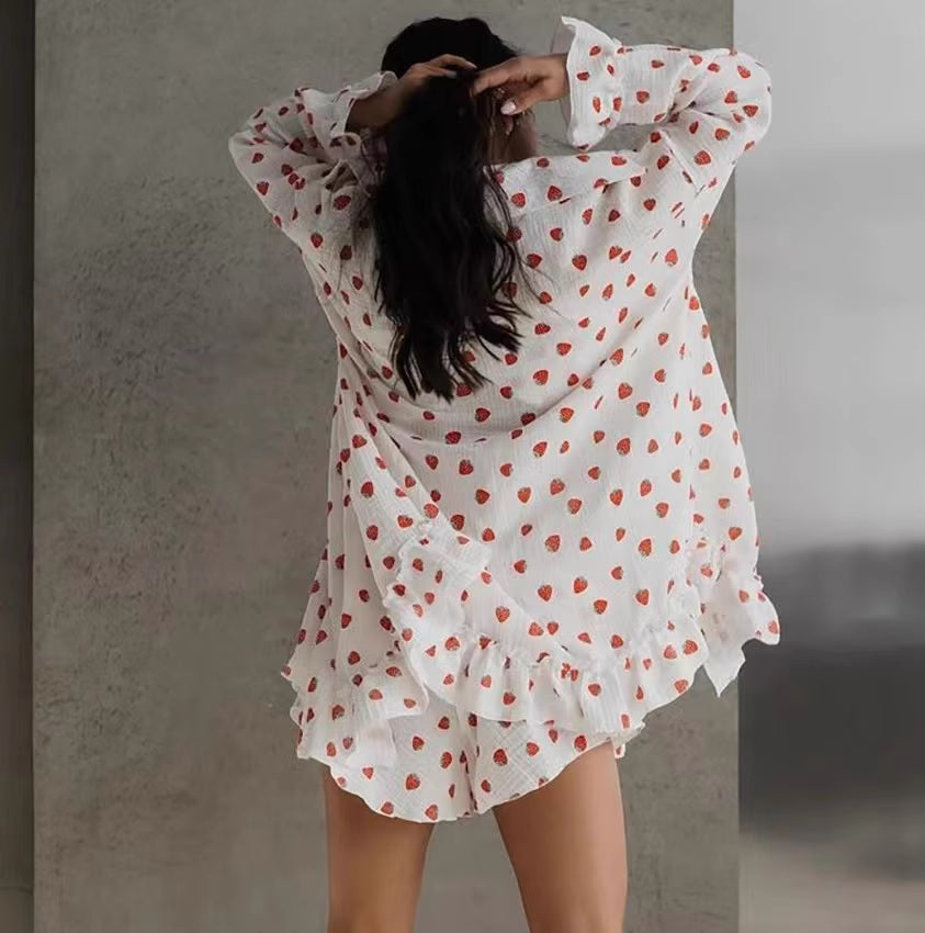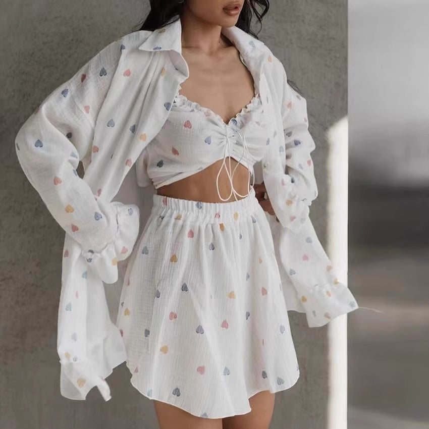 Комплект от три части със сладък принт. Този чаровен комплект включва топ, къси панталони и риза с щампи, които придават игрив и романтичен вид. Топът е с изящни детайли и приятна за носене материя, докато късите панталони добавят елегантност и движение към визията.