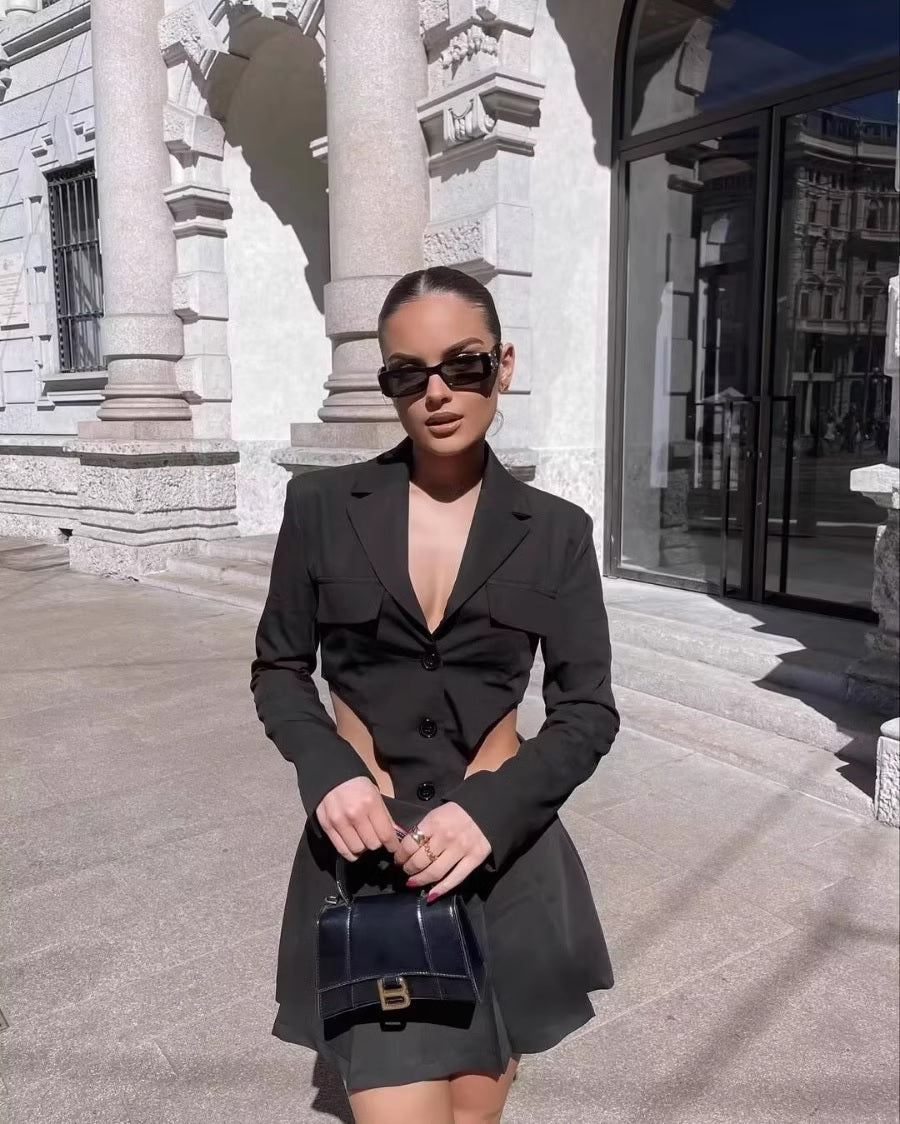 Този модел включва елегантно късо сако с два джоба и закопчаване с двоен ред копчета.