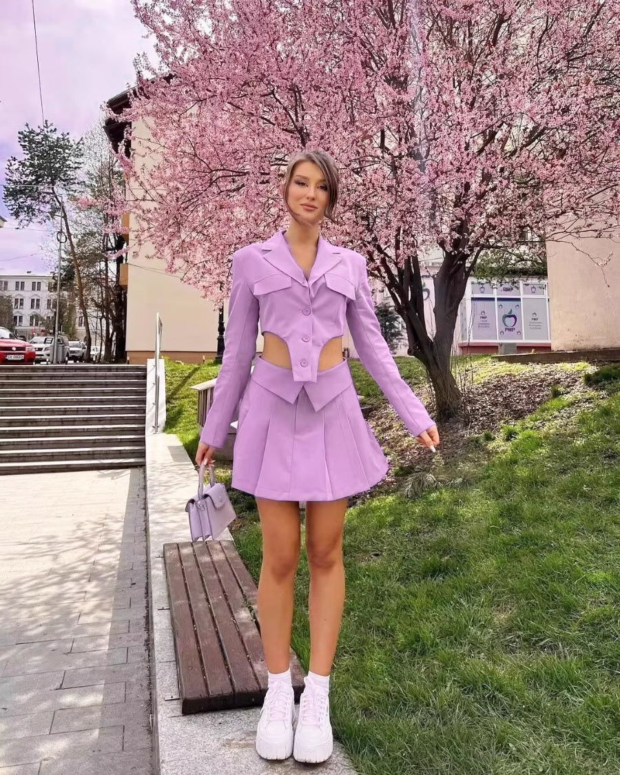 Широка плисирана пола с обръщащ се краен ръб, който добавя интересен и модерен акцент към визията. Комбинацията от сакото и плисираната пола придава на тоалета уникален и стилен вид,
