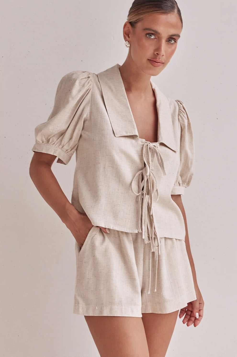 Стилен дамски комплект с къси панталони и топ – изискано съчетание на комфорт и елегантност. Перфектната кройка подчертава силуета, а леката материя осигурява лекота и удобство. Идеален за модерна и уверена визия в топлите дни.