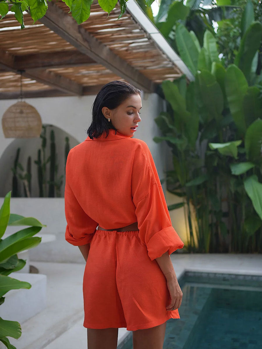 ✔ Дизайн: Комплект от широка риза с копчета и къси панталонки с ластик за пълен комфорт и небрежна елегантност