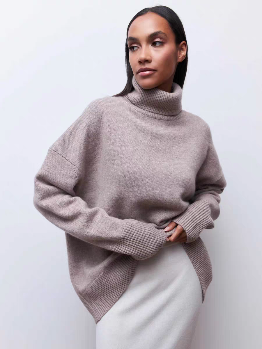 Този свободен пуловер е създаден за дамите, които ценят както модата, така и удобството в ежедневното си облекло.Високата яка добавя допълнителен слой защита срещу студения въздух, като същевременно придава елегантен и изискан вид.