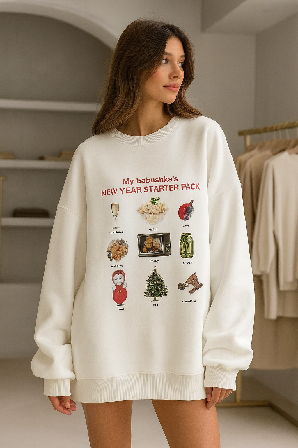 Щампата “My Babushka’s New Year Starter Pack” носи усмивка и ретро чар, докато свободната кройка и меката памучна материя гарантират максимален комфорт.