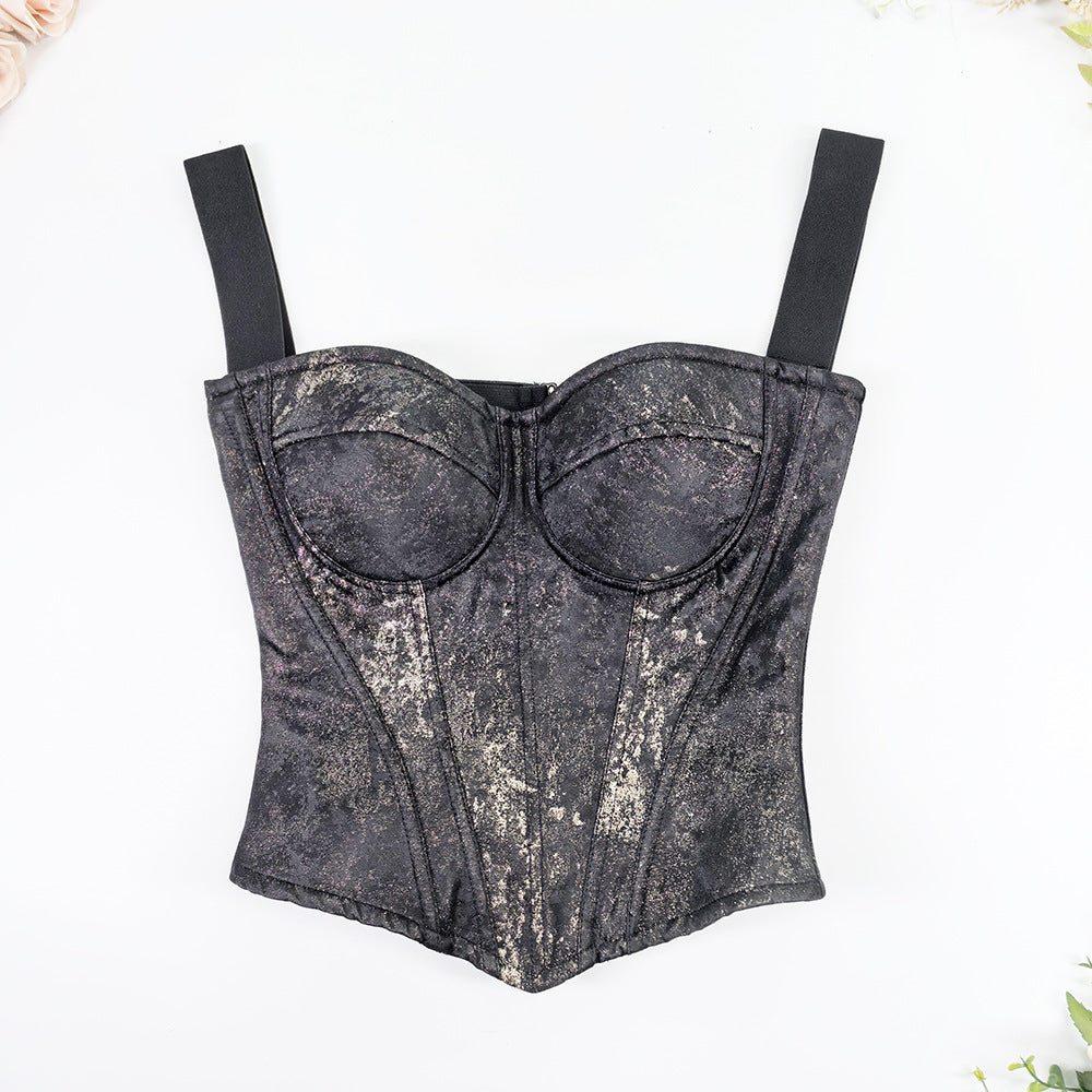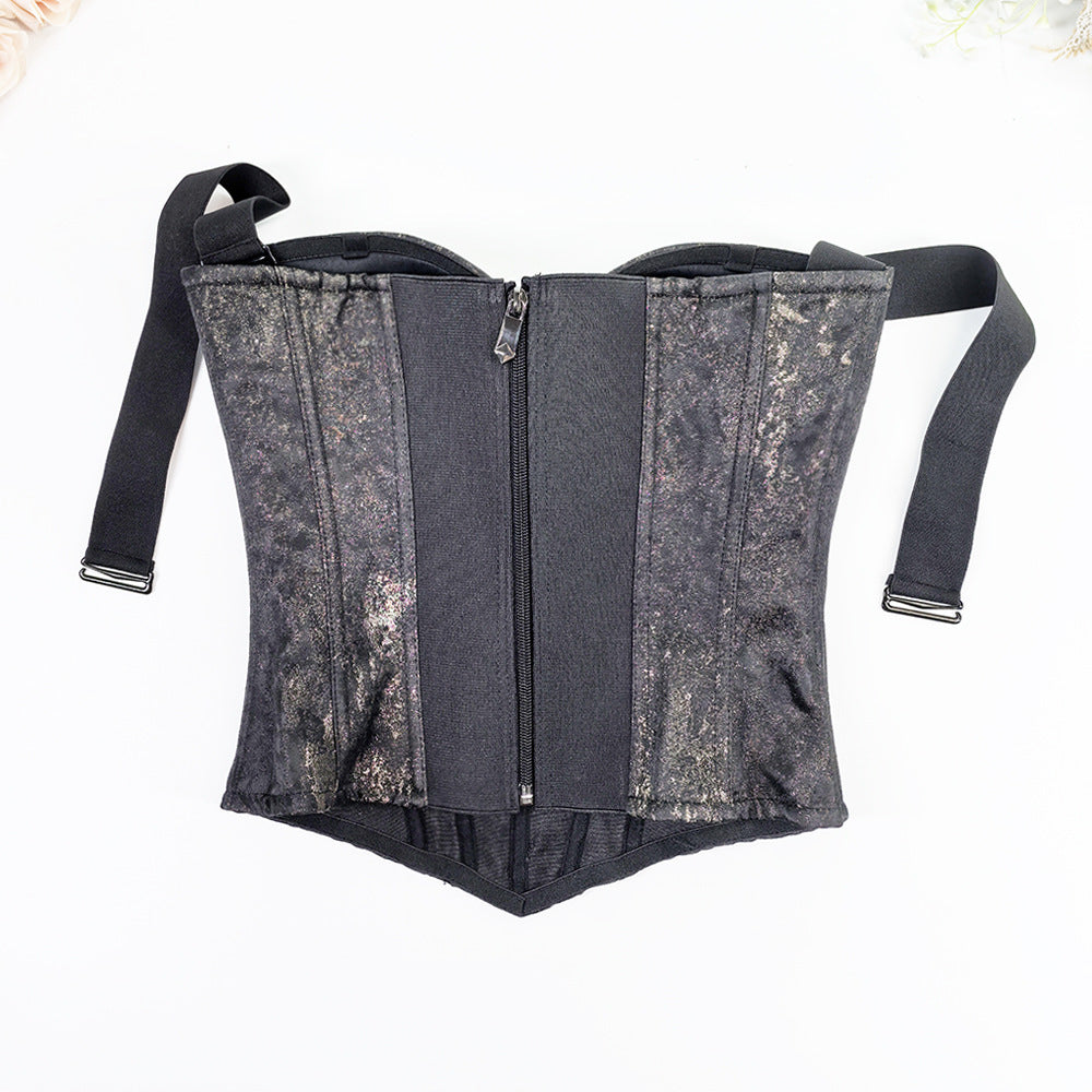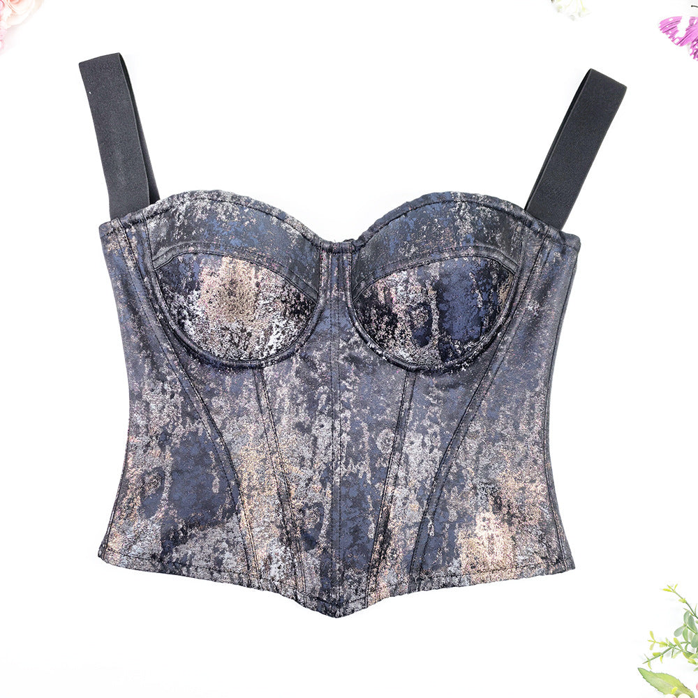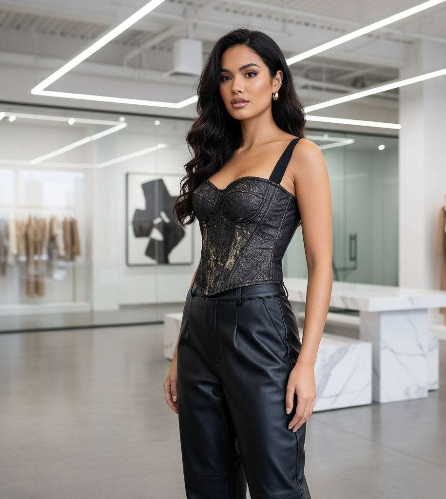 Внесете драматичен и изискан акцент във визията си с нашия корсетен топ с металически блясък. Неговият уникален текстуриран десен в нюанси на черно и сребристо привлича погледа, докато подчертаната кройка осигурява елегантен и стилен силует. Идеален за вечерни излизания или специални събития, този топ е перфектно съчетан с панталони с висока талия или пола за една незабравима визия.