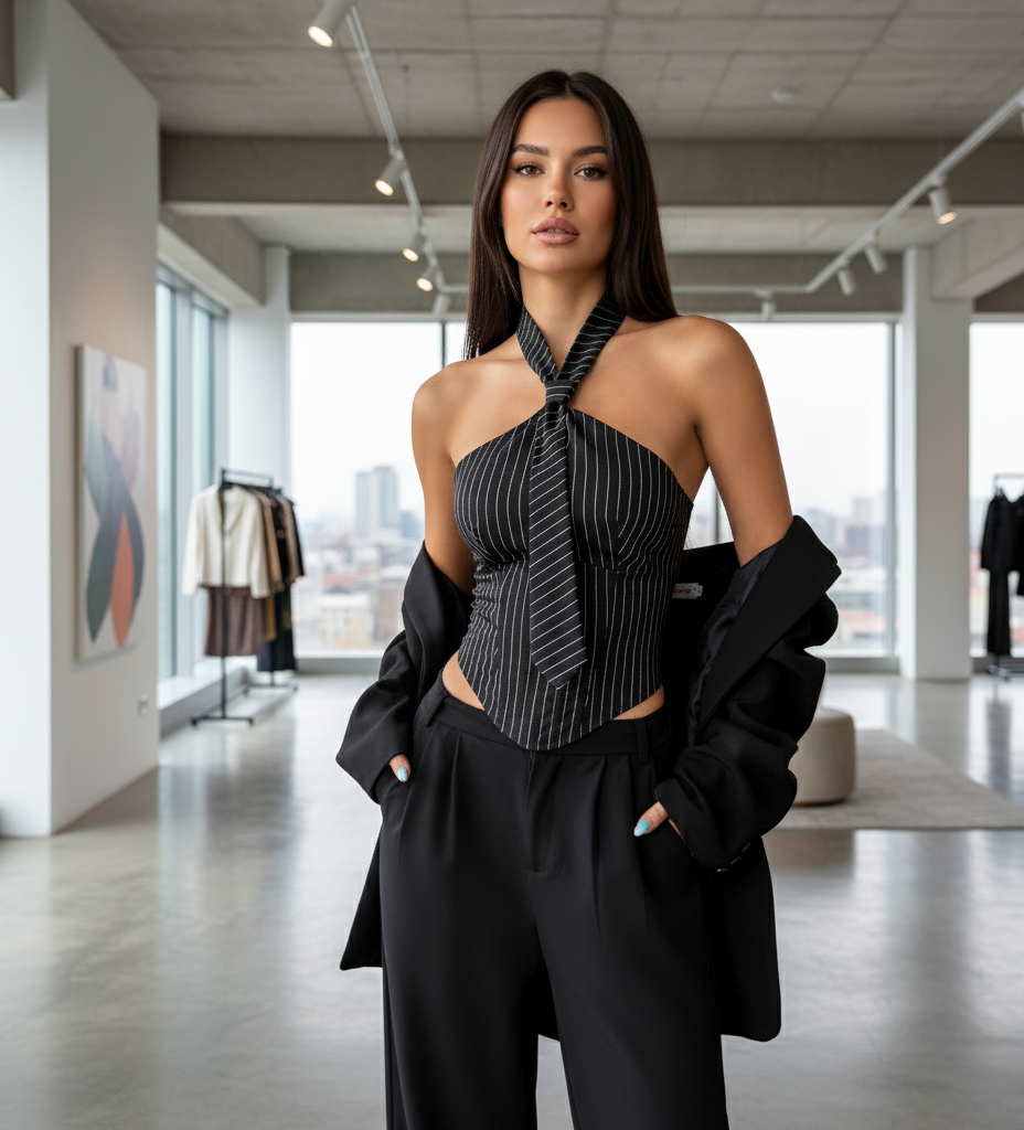 Power Chic Tie Bustier е смел и елегантен топ, вдъхновен от бизнес стила с модерен обрат. Дизайнът с вратовръзка отпред и фино райе придава изтънчена визия, докато прилепналата кройка подчертава силуета и добавя женственост. Изработен от висококачествена материя с лек еластичен ефект за комфорт и перфектно прилягане. Комбинирайте го със сако и широк панталон за впечатляваща офис-вечерна визия или го носете с дънки за модерен street style. Идеален избор за уверени жени, които обичат да експериментират със стил.